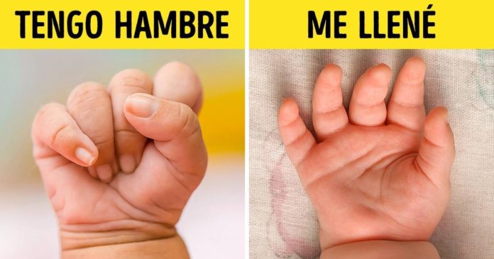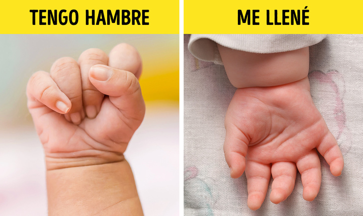 Se agarra de las orejas. En la mayoría de los casos, solo es un movimiento de “concientización”, el bebé se explora a sí mismo. Solo hay que llevar al niño al médico si ese movimiento se acompaña de llanto y se repite con frecuencia. - Aprieta los puños: Signo de hambre. Al verlo a tiempo, se puede evitar el llanto hambriento.