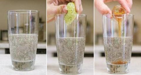 Debes sumergir las semillas de chía en la parte del agua (100 ml). esta agua con semillas debe reposar al menos una hora, pasado este tiempo las semillas estarán tomando la consistencia gelatinosa, luego de este tiempo se agrega el jugo de limón, para después añadir el resto del agua. Debes batir la mezcla por unos segundos, y endulzar con la miel, según sea tu gusto, y debes tomarla en ayunas al despertar.